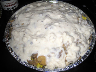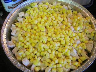 - Layer the rest of the ingredients in the following order, using half for each pan: chicken, corn, mushrooms, soup mixture, and cheese.