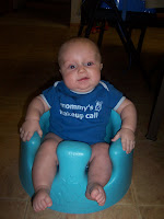 Joshua rolled from his tummy to his back for the first time yesterday – just seconds after I asked Stephen, “Should I be worried that he hasn’t rolled over yet?” He is a very squirmy boy and manages to spin himself in almost a complete circle when he lays on the floor! Stay tuned for more movement updates! He also likes to sit in the Bumbo seat – I love that it makes him look even chubbier 🙂